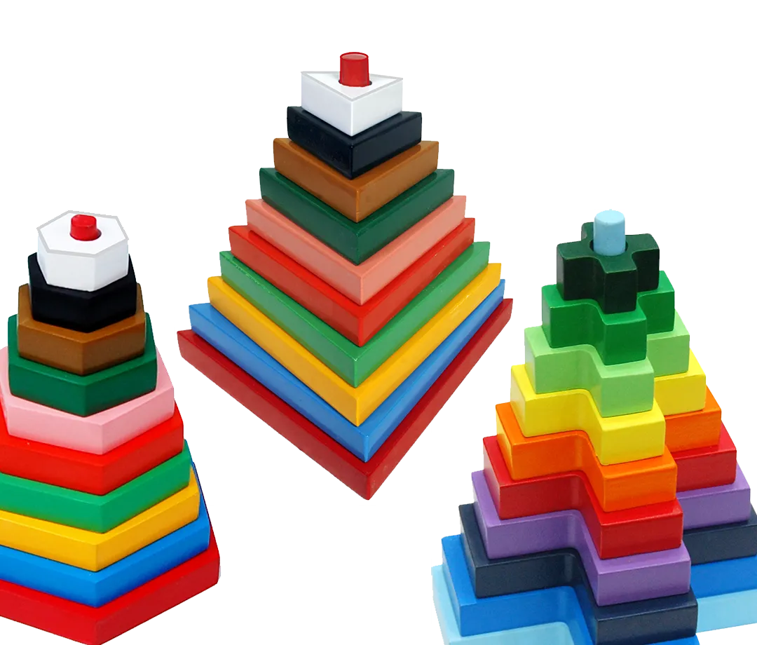 Wooden toys with different shapes and colors aid in the development of children's fine motor skills.