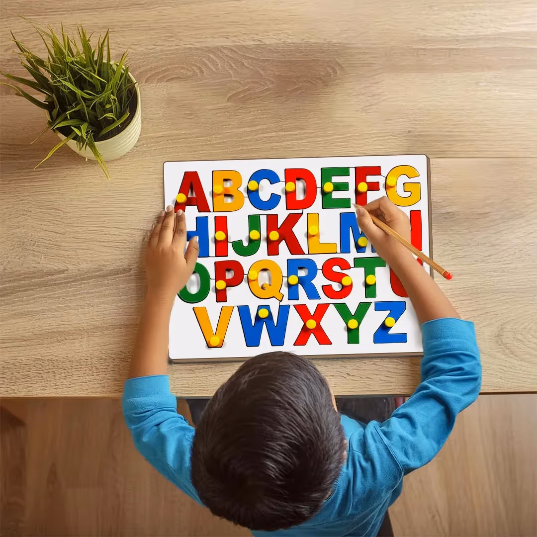 A wooden English alphabet tray with knob is a tactile educational tool designed to aid children in learning the alphabet. Featuring compartments for each letter, it encourages hands-on exploration and reinforces letter recognition.