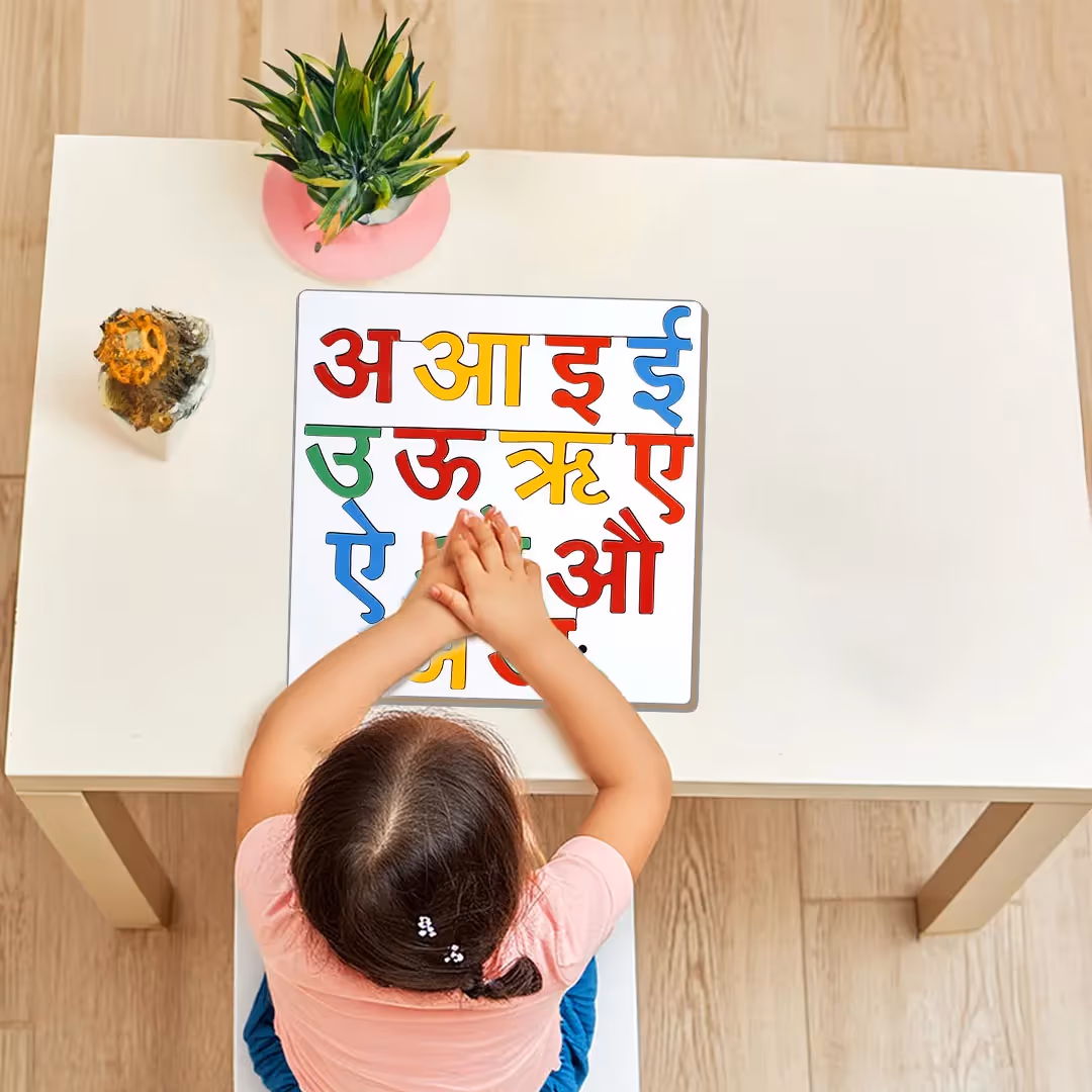 - Each vowel meticulously carved and labeled in clear Hindi script for easy recognition.