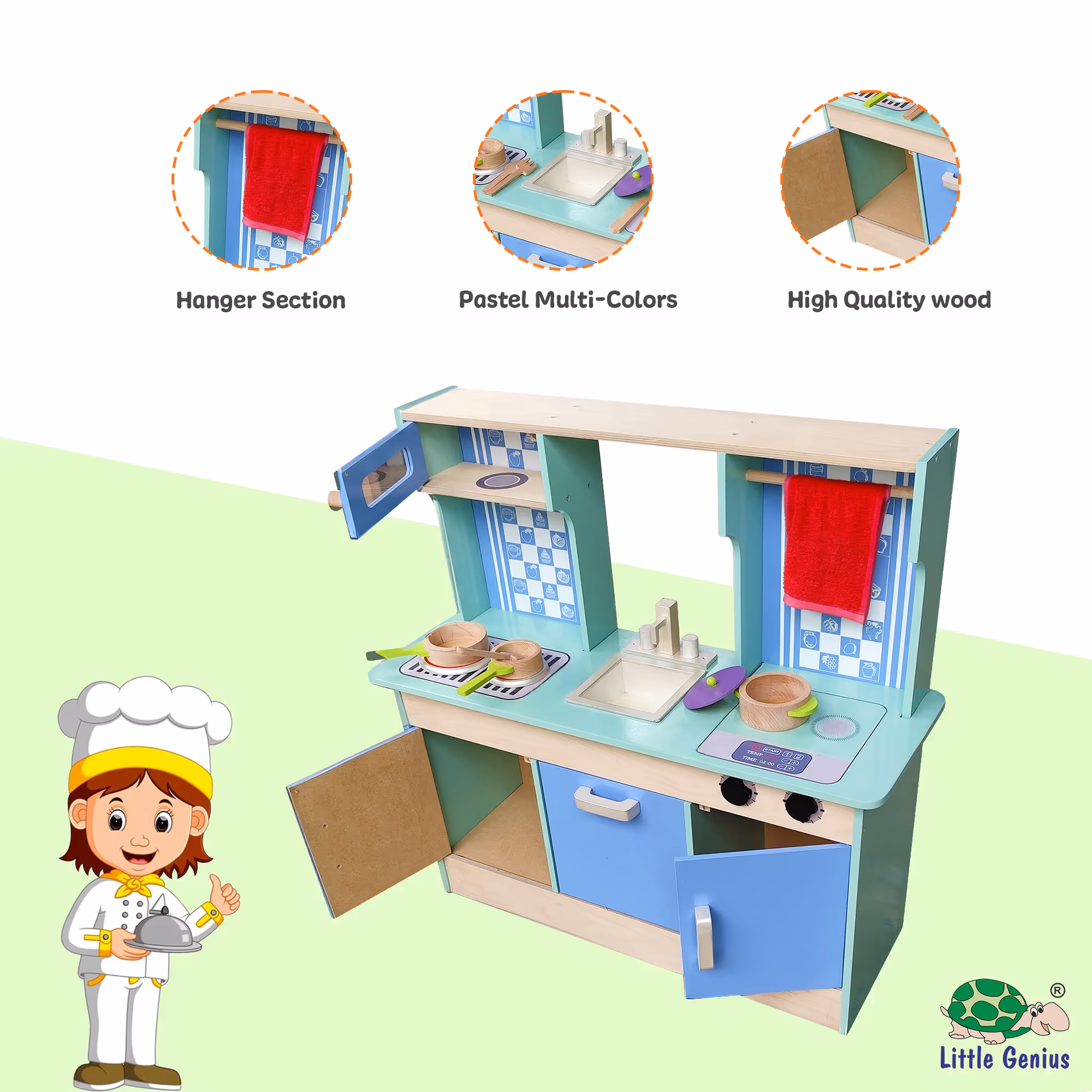 Transform playtime into a delightful culinary adventure with this charming wooden kitchen set in soothing mint green and blue colors. The thoughtfully designed storage solutions help children learn organization while playing.