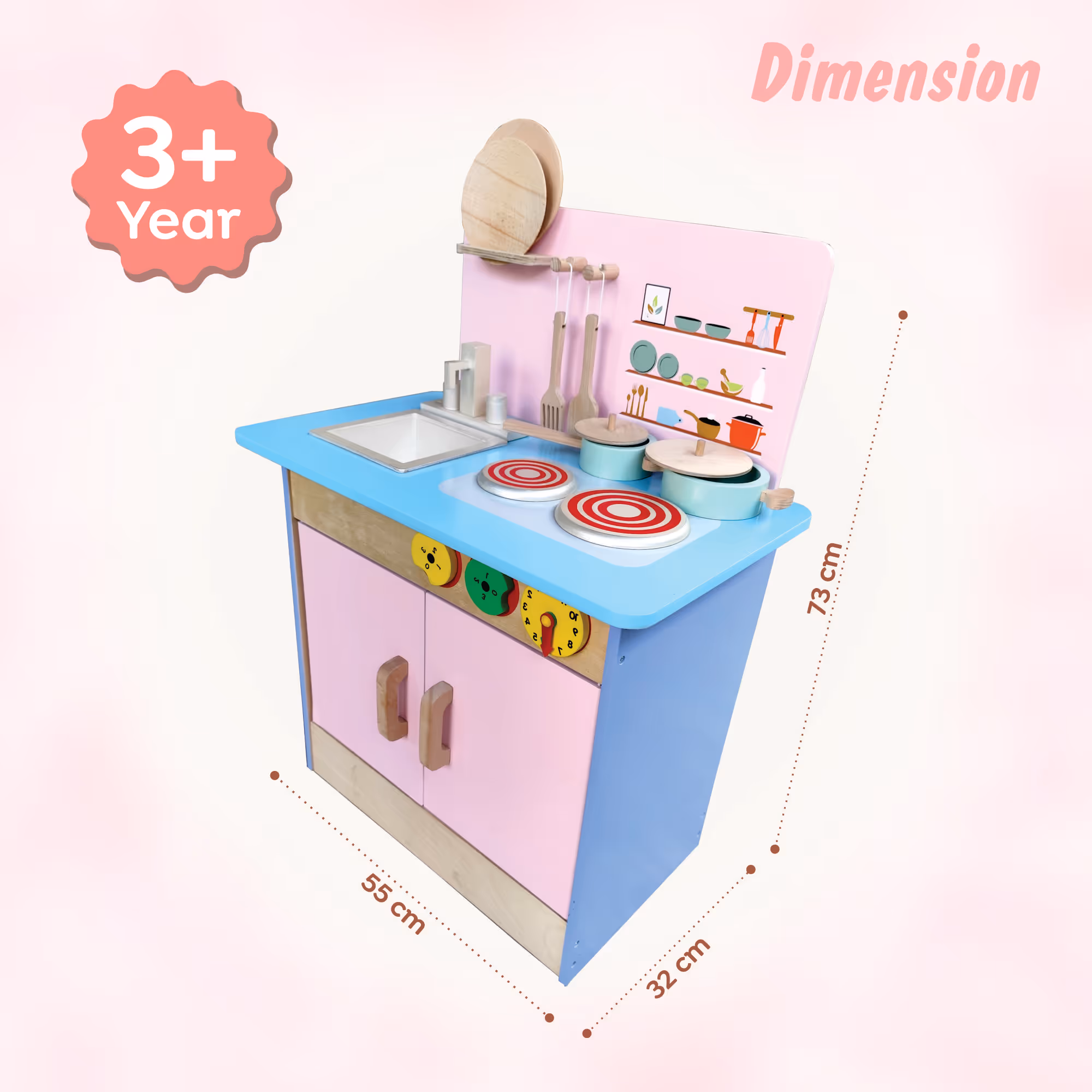 Transform playtime into a delightful culinary adventure with this charming wooden play kitchen set in soothing pink and blue colours. This beautifully crafted kitchen features a spacious storage cabinet, a realistic cooktop with turning knobs, and an adorable clock face to help little ones learn time while they play.