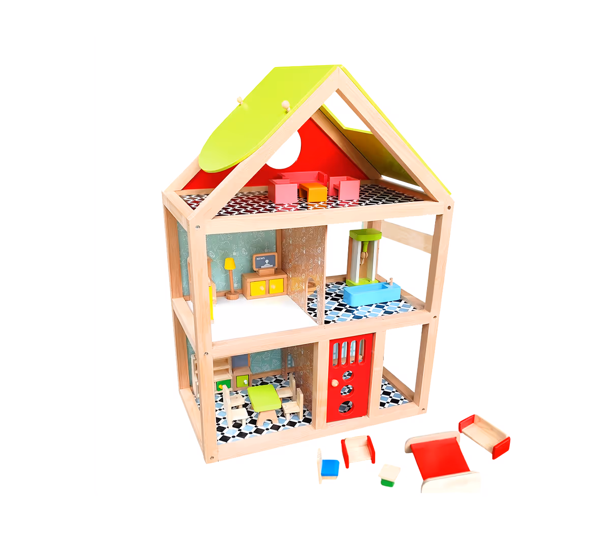 Wooden Dollhouse with Furniture, 3 Floors, Modern Design