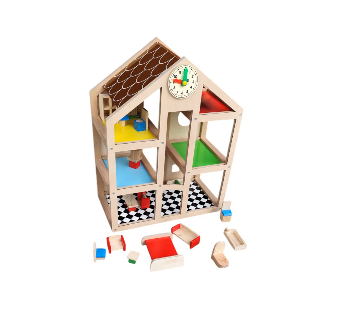 Wooden 3-Story Dollhouse with Movable Clock